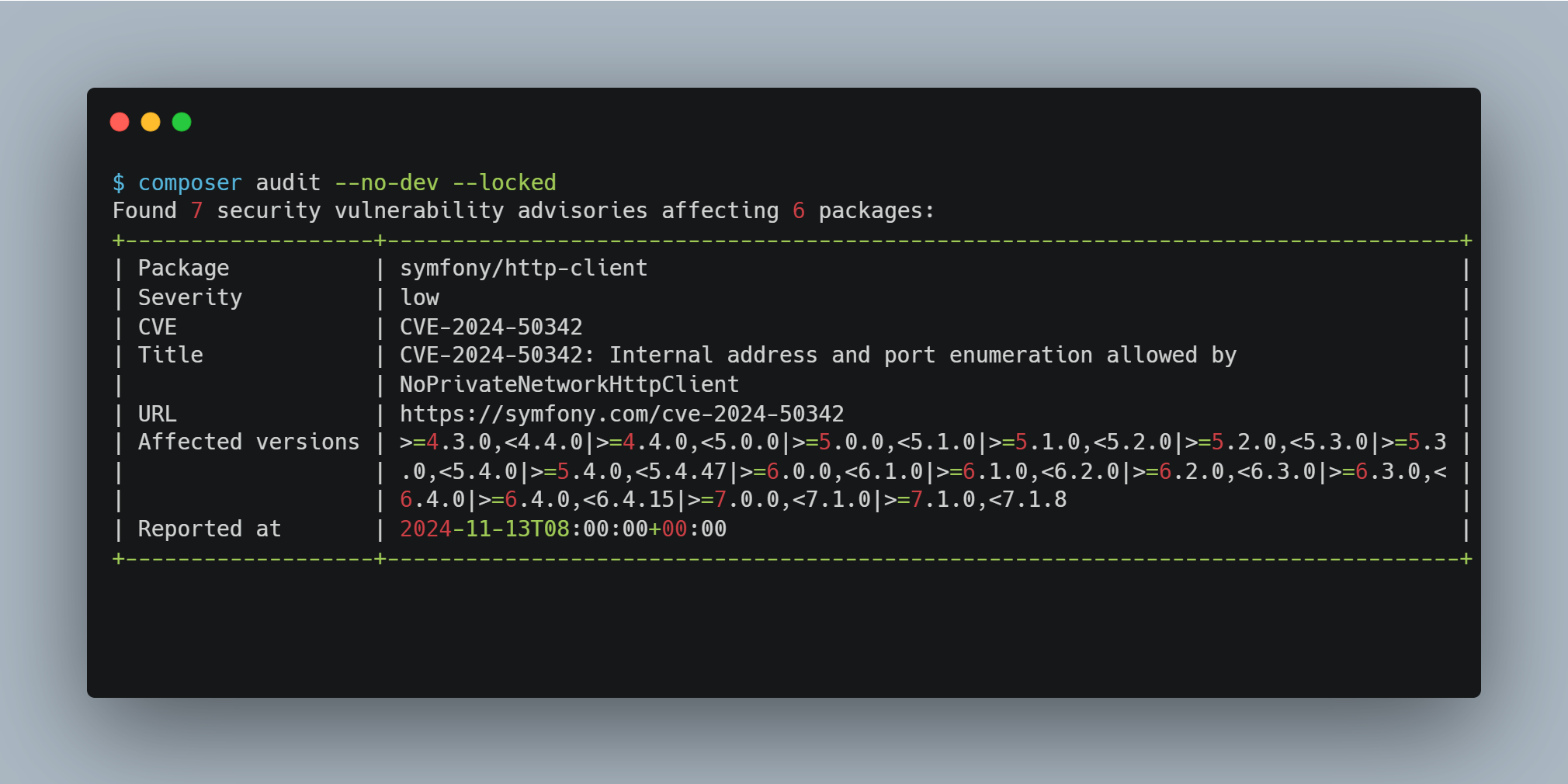It is therefore crucial to put in place a policy of regular updates to guarantee the security of your dependencies. A major advantage of Composer is its built-in command, which can detect vulnerabilities in the packages used by your application.