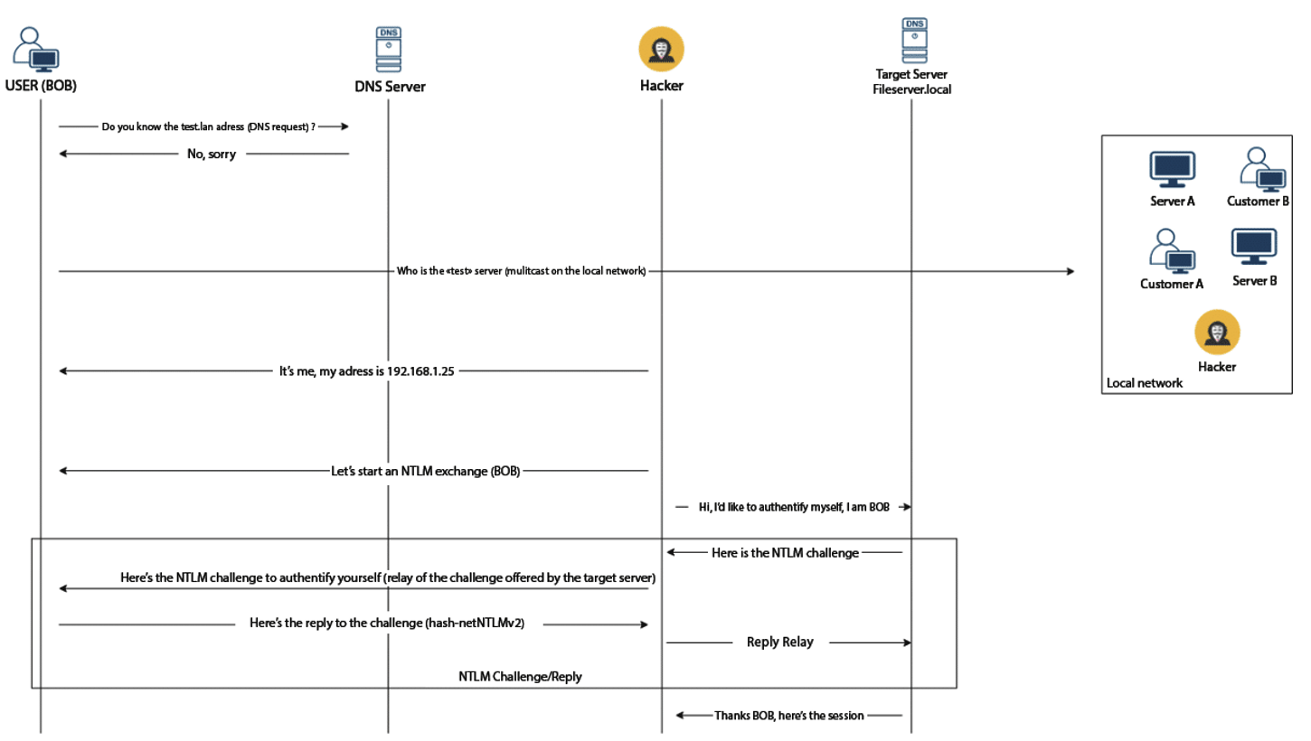 In addition, NTLM can interface with most known protocols such as HTTP, SMB, FTP, SQL, LDAP, etc. However, it is important to note that all client-server exchanges are carried out in clear text over the network.