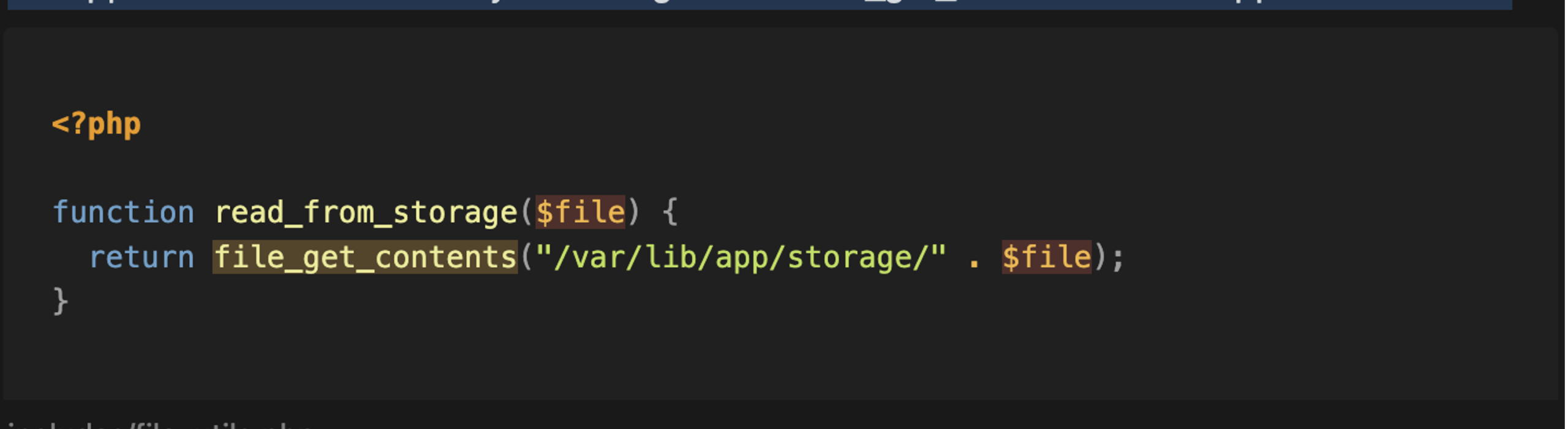 When analysing the application’s sinks, we seek to identify all dangerous functions that could be called. For example, we can start by searching for calls to the file_get_contents function in the application code.
