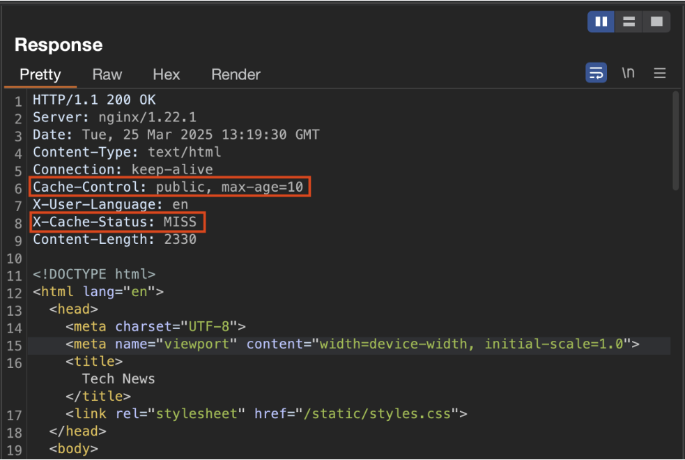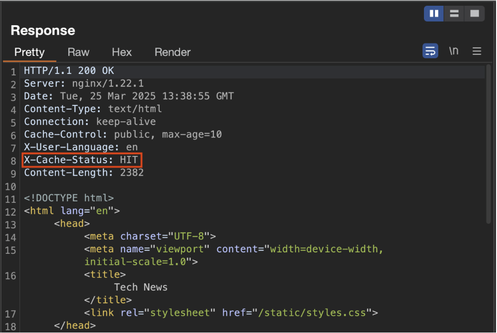 By manually adding the X-Forwarded-Host header to a request, with a value pointing to a server we control, and ensuring that the response actually comes from the server (i.e. with an X-Cache-Status at MISS), we can see that the content of the response is modified, and the /static/script.js file is now loaded from our own address: