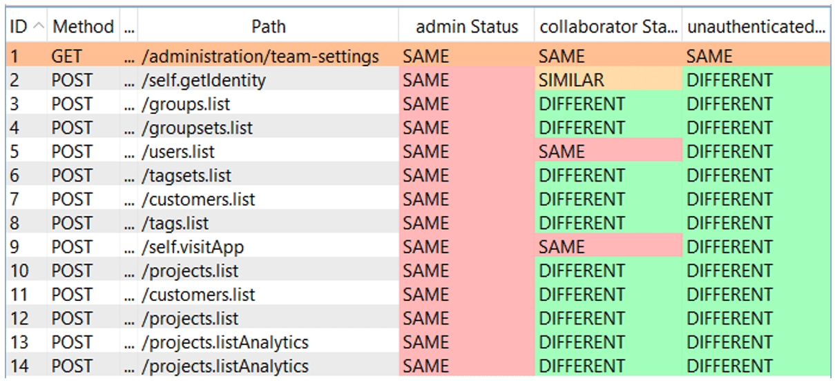 Thus, the extension will replay all requests with the different session tokens provided. A colour code then allows us to identify any broken access control.