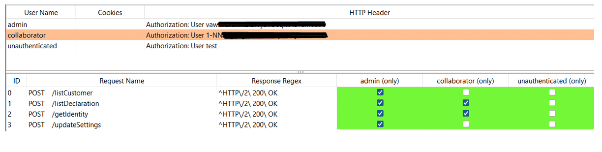 In the example below, 3 different sessions have been provided to AuthMatrix: admin, collaborator and an invalid session token – unauthenticated.