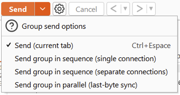 There are several options for sending a group of requests. You can choose to send them via one or more connections, or in parallel using the last-byte synchronisation technique.
