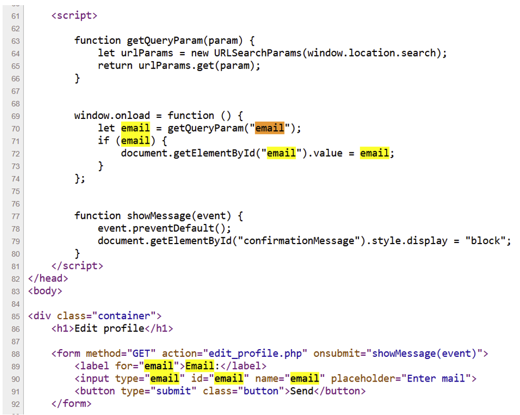 Examination of the source code reveals that the website integrates JavaScript code. This code retrieves the value of the email parameter contained in the url to pre-fill the email field.