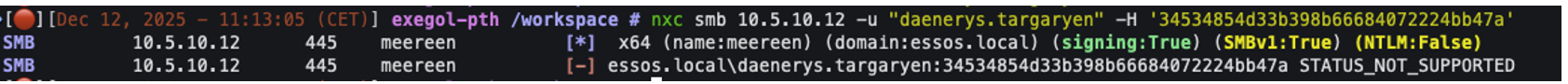 Thus, after adding the ‘daenerys.targaryen’ account to the ‘Protected Users’ group, it is no longer possible to use the NTLM protocol to authenticate to the machine with this account, as shown in the following screenshot:
