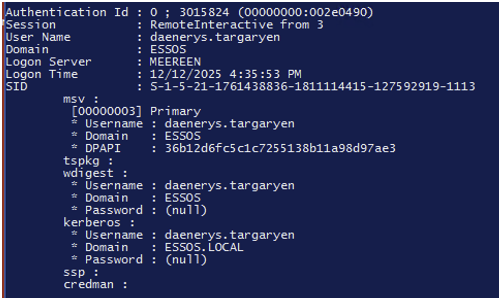 In the following screenshots, we can see that the NTLM hash for the ‘daenerys.targaryen’ account is no longer present, unlike the hash for the ‘jorah.mormont’ account, which is not part of the ‘protected users’ group.