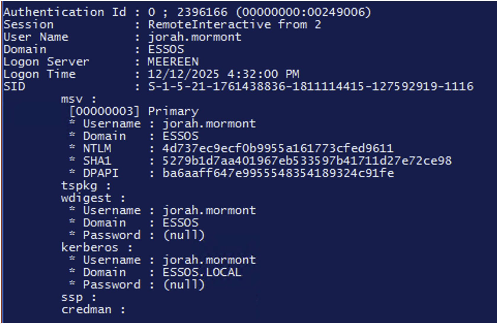 The other secrets are directly in the LSASS process. It is this process that manages authentication, applies local policies, and generates access tokens that determine a user’s privileges once logged in.