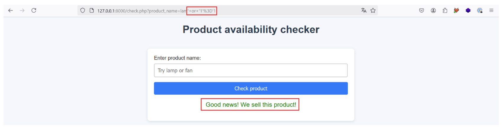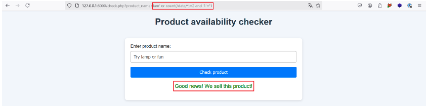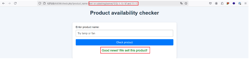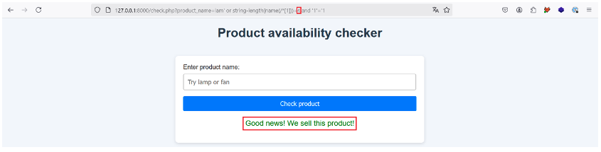If it returns true, ‘Good news! We sell this product!’ is returned. Remember, this request is just one of many possibilities, but it’s important to think about the injection point in order to exploit it effectively.