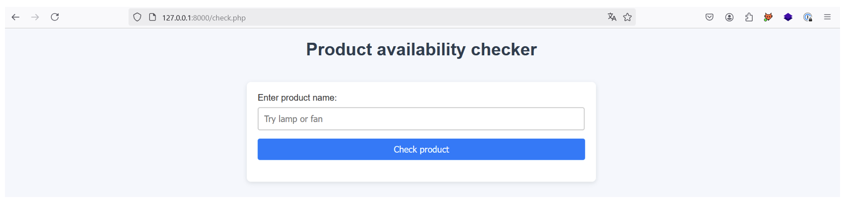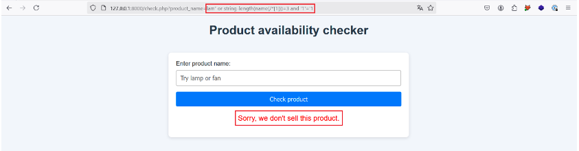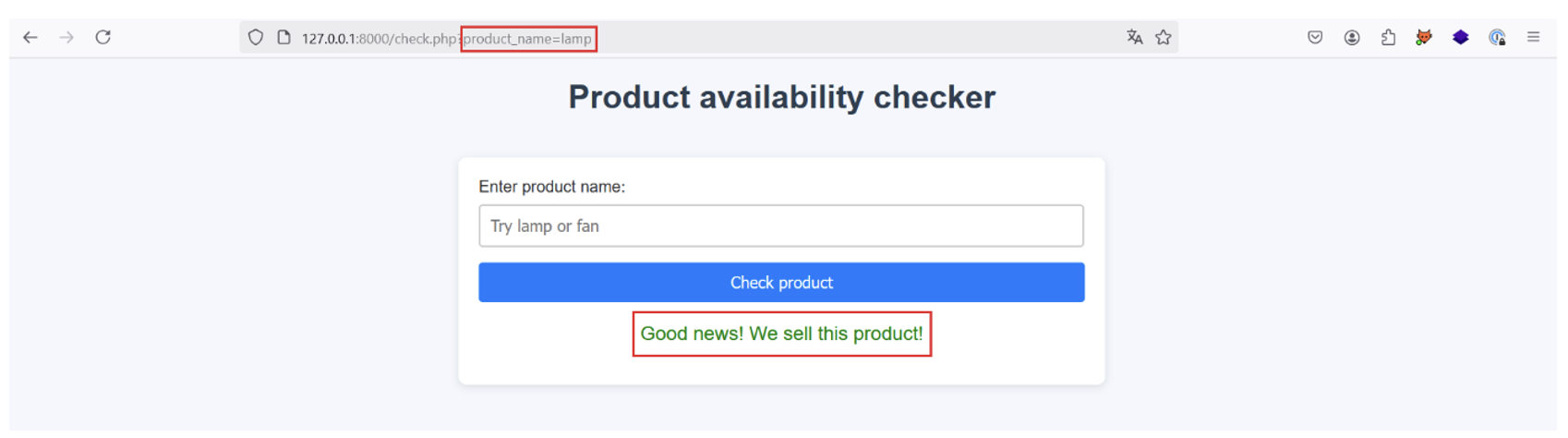 Once the ‘Check product’ button has been pressed, the user input is included in the GET product_name parameter of the request sent to the server.