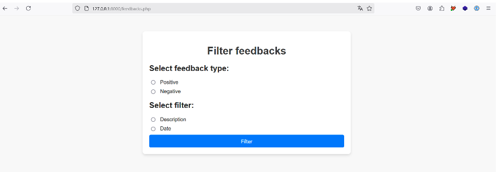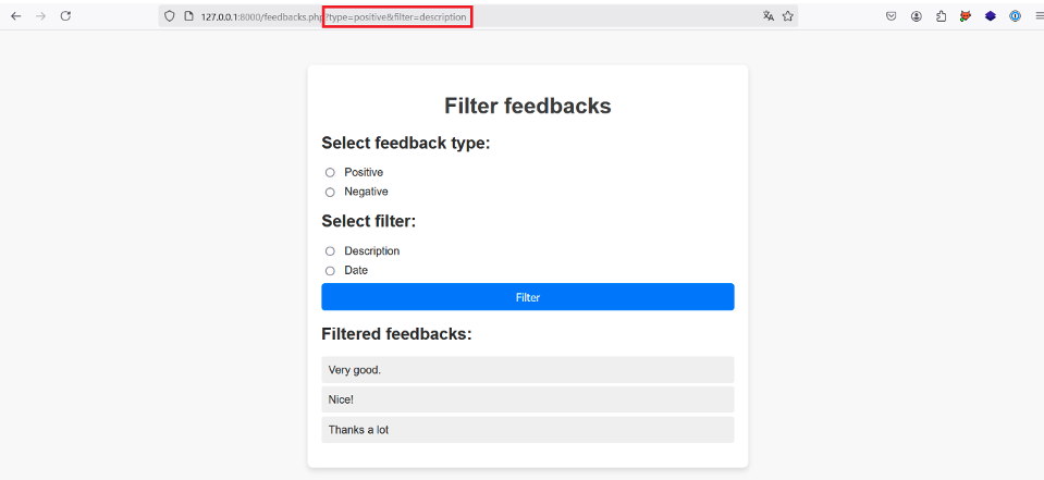 In this example, the user has chosen the ‘Positive’ and ‘Description’ buttons, which has had the effect of sending an HTTP GET request with the parameters type=positive and filter=description to the server.