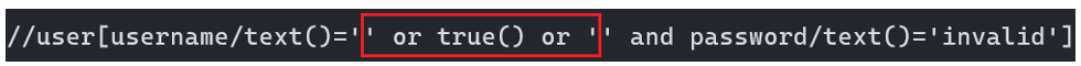 To do this, the attacker must force the request to return true. This can be achieved by injecting the following payload: ‘or true() or ’ into the username parameter and entering an arbitrary password into the password parameter.