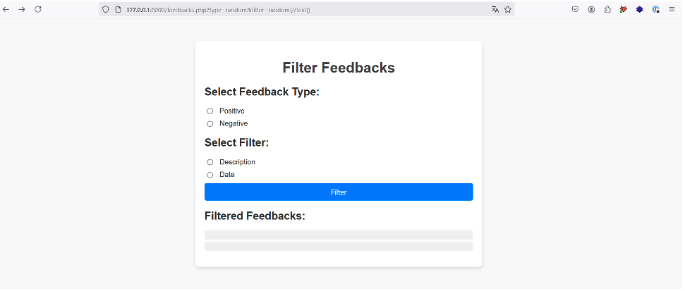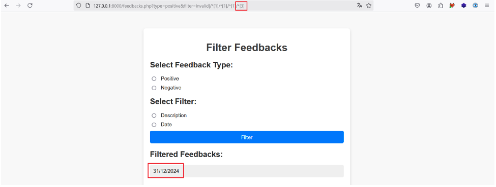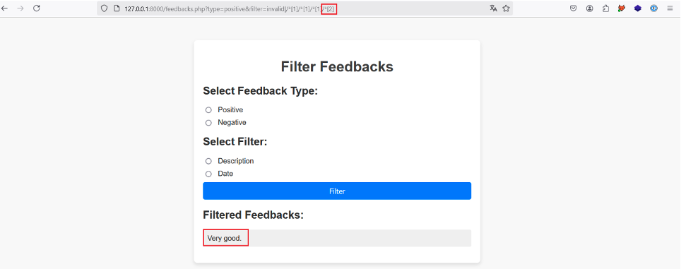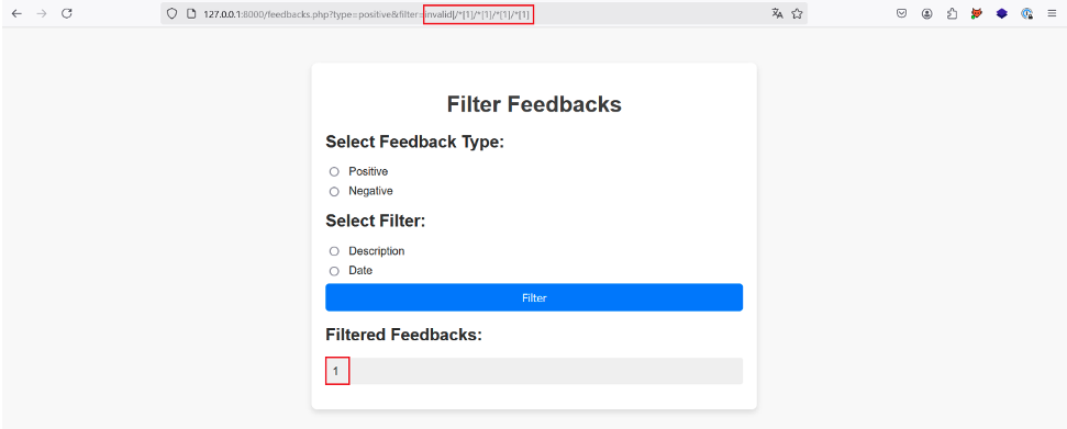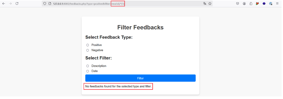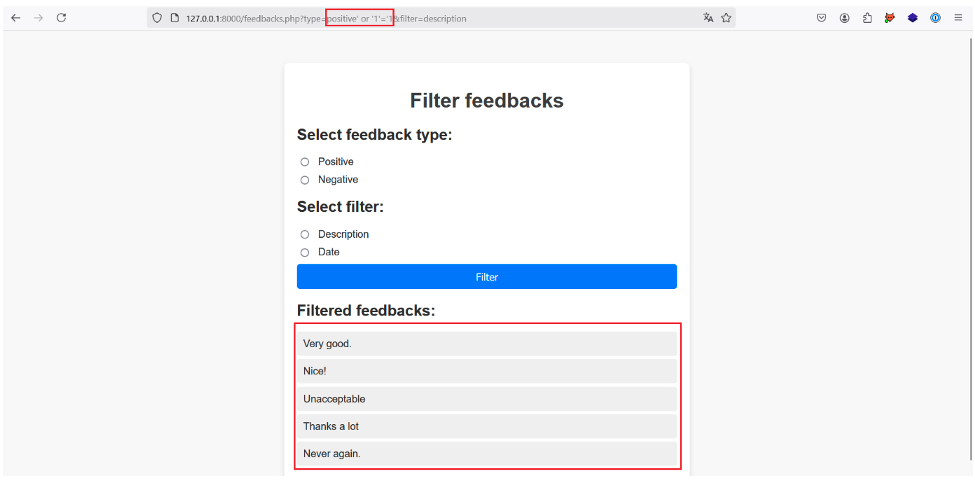 To identify whether an XPath injection is present on the type parameter, let’s try injecting the payload positive‘ or “1”=’1 while leaving filter=description.