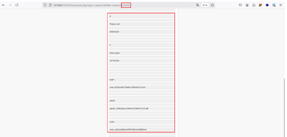 In fact, if our imagined XPath request is correct, the value of this parameter is at the end of the request, allowing us to make a new request with | and retrieve all the text nodes in the XML document with //text().