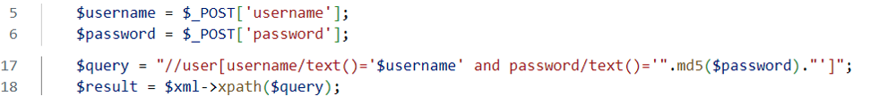 The XPath query in line 17 directly includes the user entries username and password without cleaning them up.