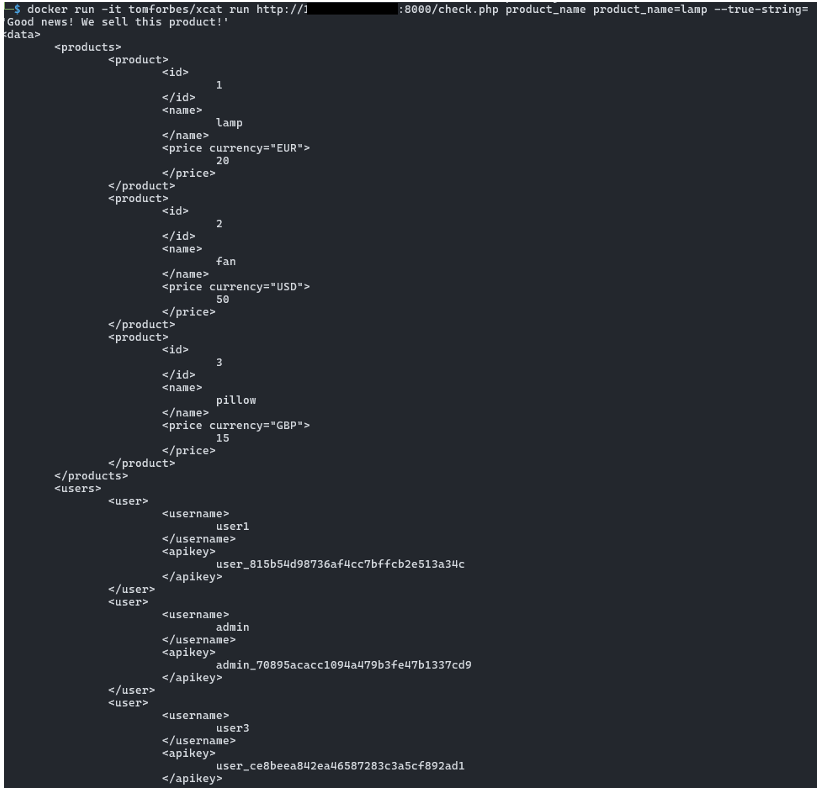 For example, the following command automatically extracts the entire XML document: xcat run http://127.0.0.1:8000/check.php product_name product_name=lamp --true-string='Good news! We sell this product!