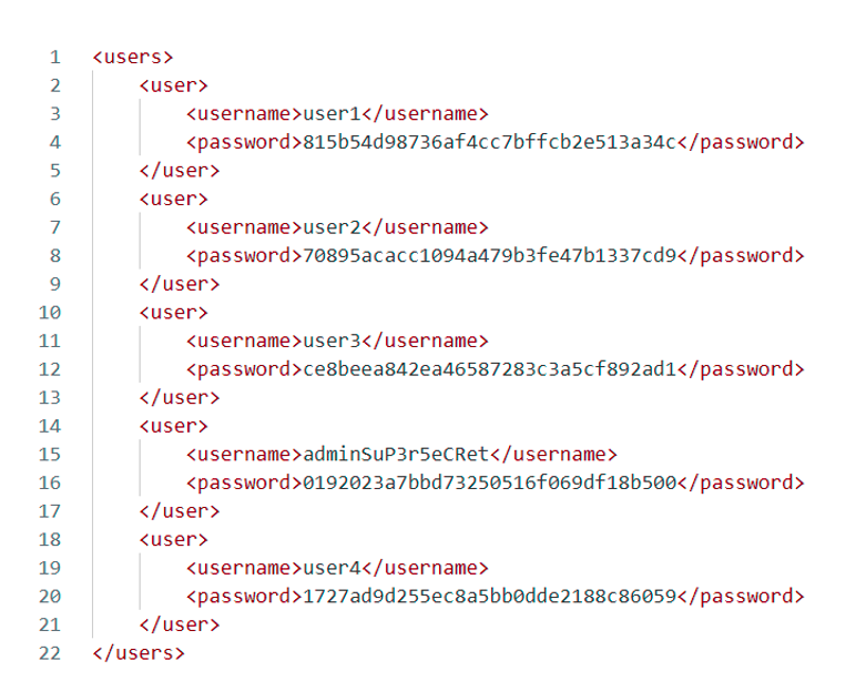 In addition, the following XML document, which is obviously inaccessible, stores user names and their hashed passwords on the server: