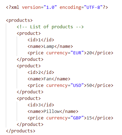 | Select all the ‘currency’ attributes | /products/product/price/@currency /products/product//@currency //@currency |