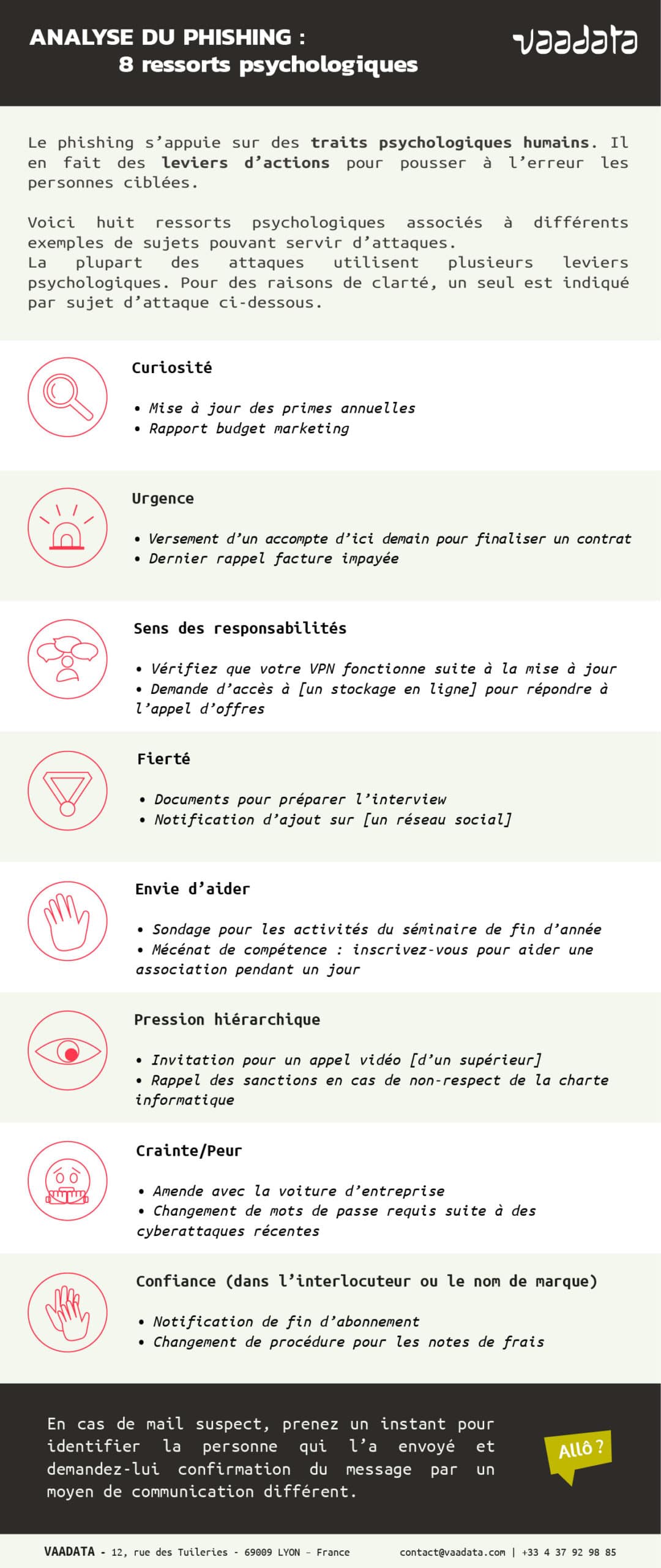 Mais aujourd’hui, nous nous intéressons aux leviers qui poussent à l’action lors d’un phishing. Nous avons repris huit leviers psychologiques couramment utilisés et nous les avons associés à différents sujets qui peuvent servir de prétextes pour un phishing.