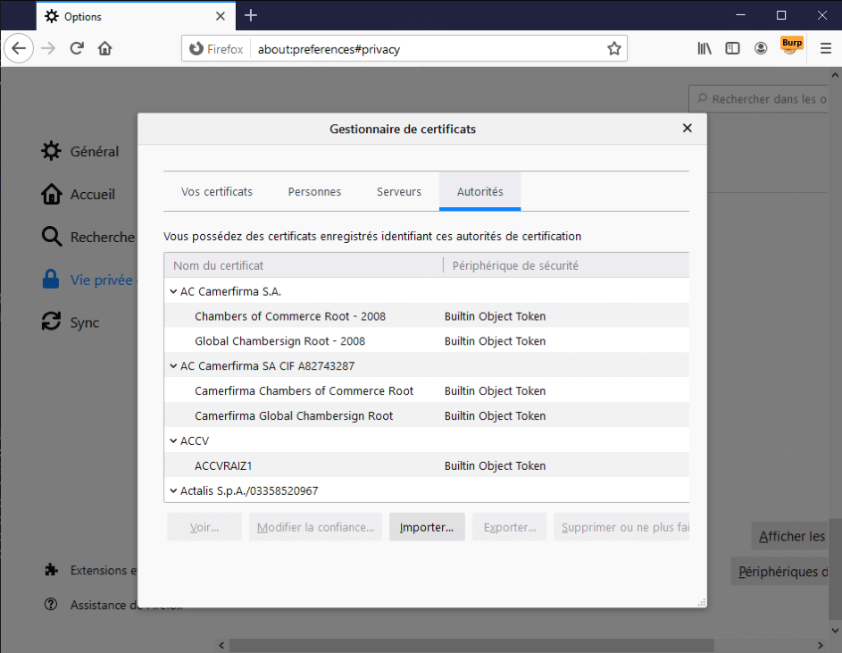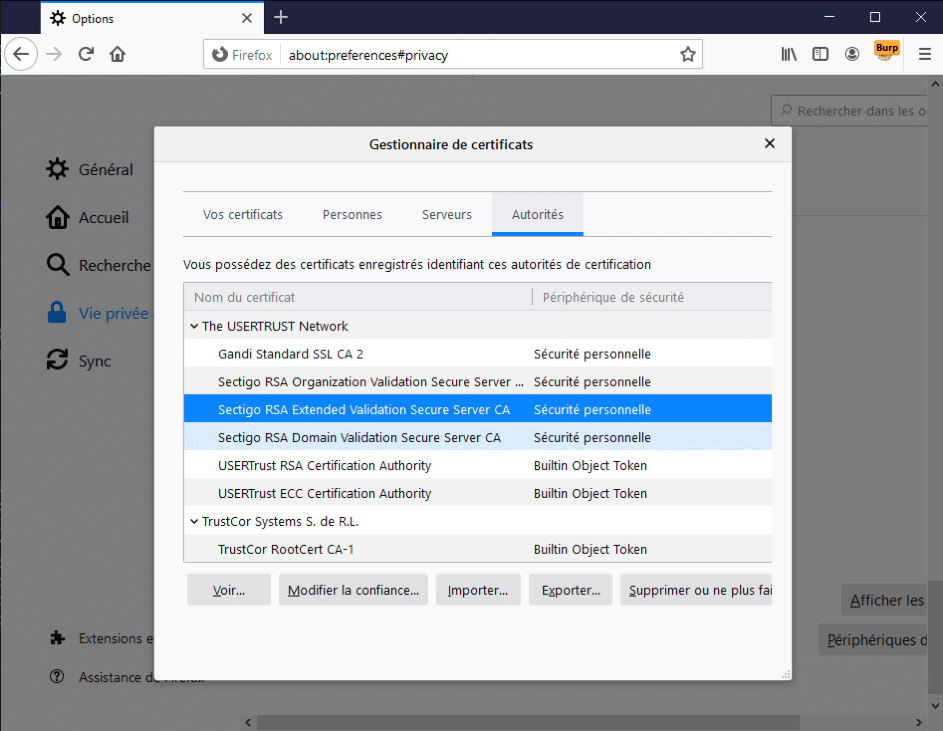 Par exemple dans Firefox nous pouvons voir la liste des autorités de certification dans : Options > Vie privé et sécurité > Certificat > Afficher les certificats