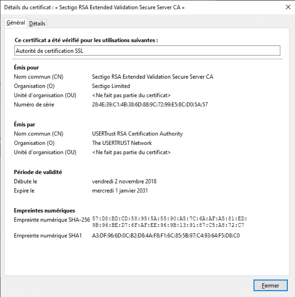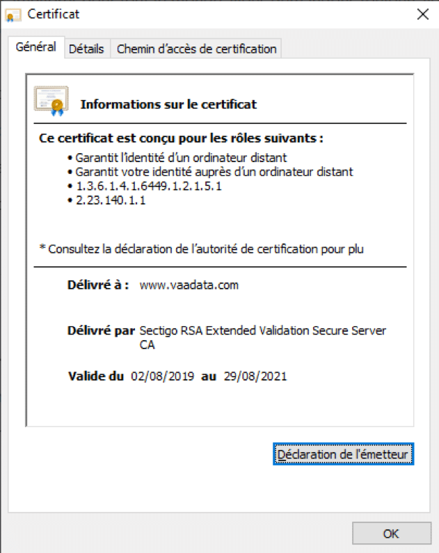 Nous voyons que le certificat a été délivré par Sectigo RSA Extended Validation Secure Server CA. Il s’agit donc d’une autorité de certificat (visible avec le CA). La chaine de confiance de Vaadata a bien été établie.