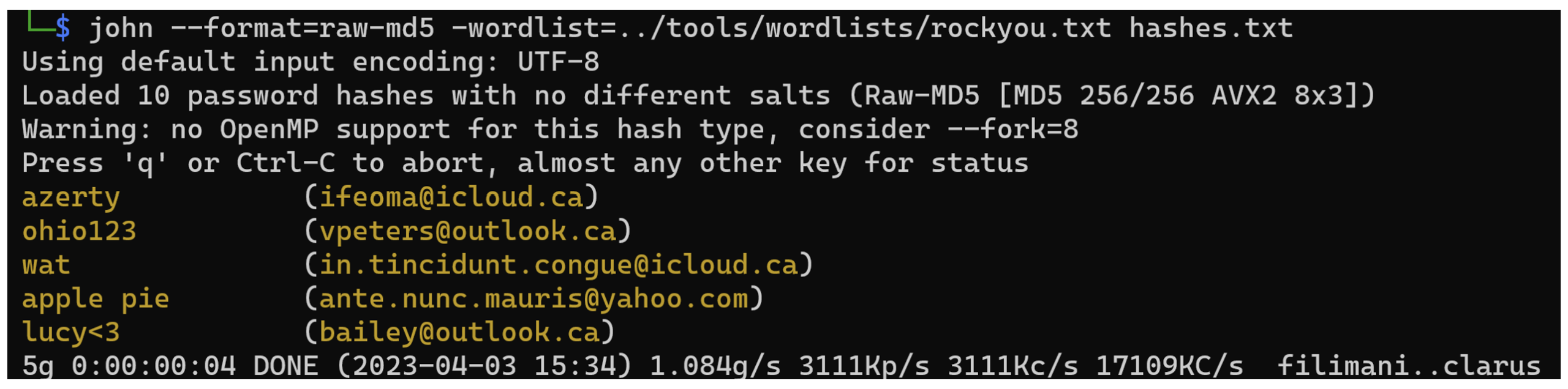 Il existe plusieurs moyens de cracker un mot de passe en MD5. Ici, nous avons opté pour une simple attaque par dictionnaire. En revanche, cette méthode ne permet pas de collecter l’intégralité des mots de passe des utilisateurs. Cependant, cela n’est pas nécessaire car il nous suffit d’obtenir quelques mots de passe, à plus forte raison s’il s’agit d’un compte administrateur.