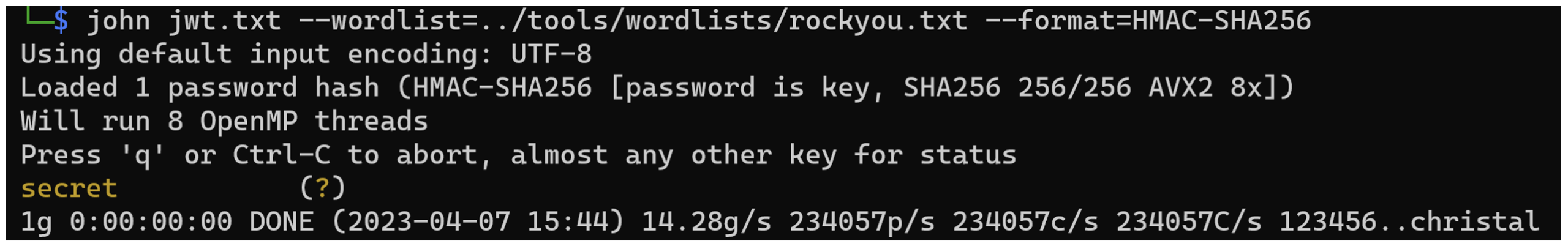 Nous savons que la signature est créée avec l’algorithme HASH-MAC256 (HS256). Tentons donc de la cracker avec, une fois de plus, John the ripper.