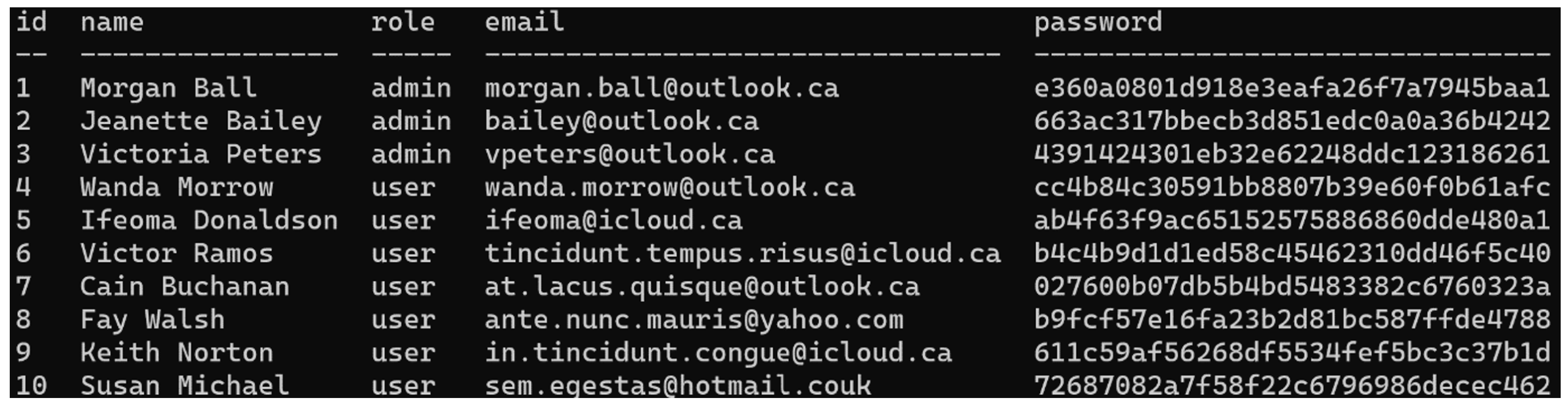 Les données de la table utilisateur que nous avons récupérée grâce à l’injection SQL sont les suivantes (pour cet exemple, les données ont évidemment été remplacées par des mock-ups) :