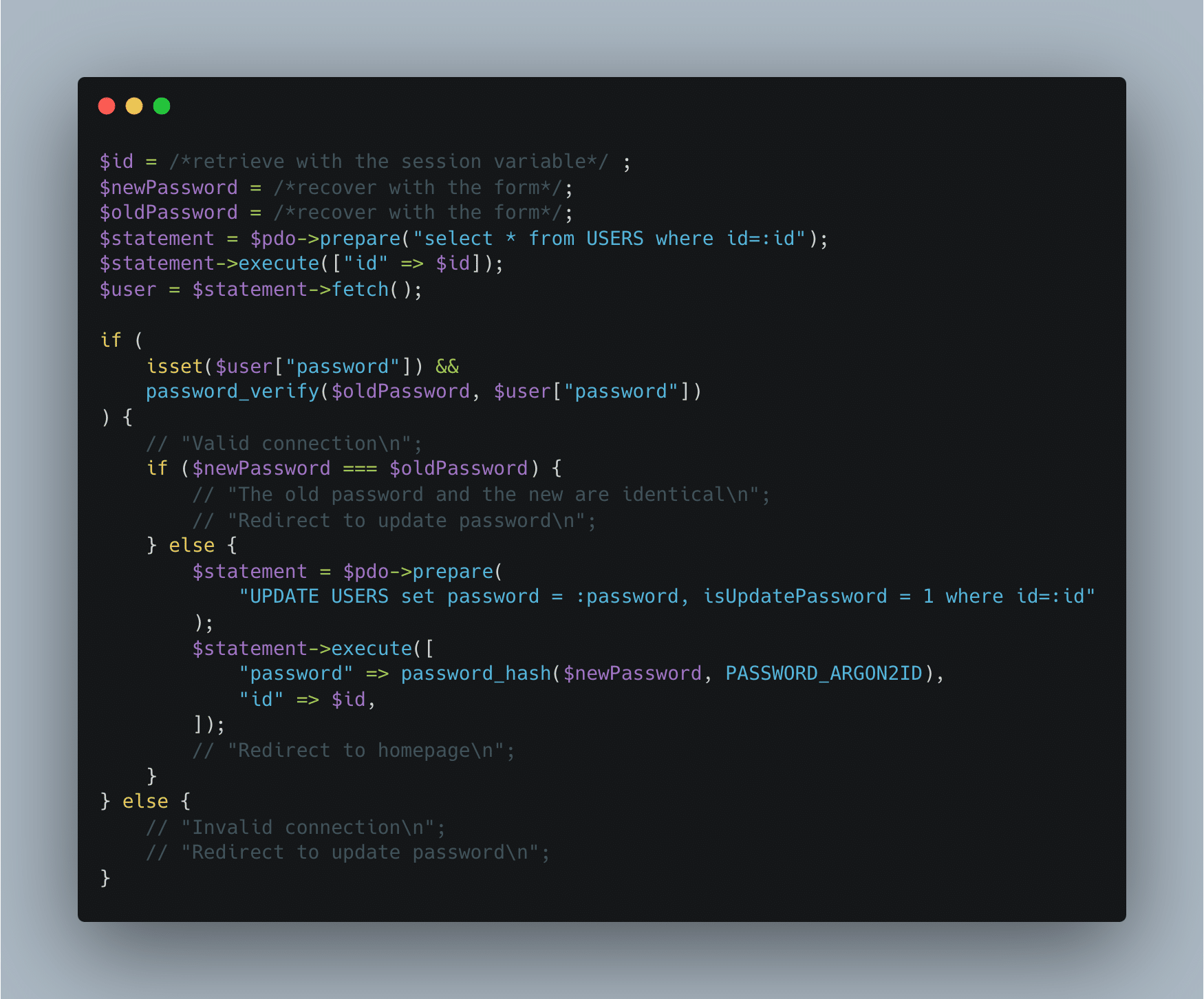Note : Ici nous vérifions uniquement que l’ancien mot de passe est différent du nouveau. Dans l’idéal, il faudrait aussi vérifier que le mot de passe respecte une bonne politique.