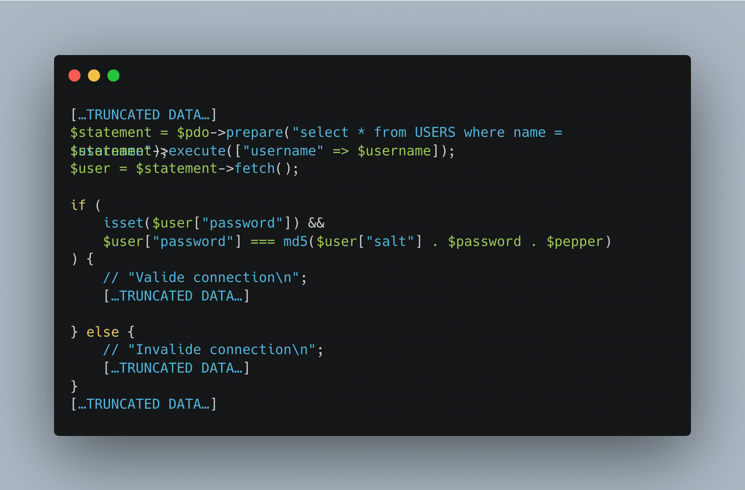 Pour notre exemple, nous nous plaçons dans un cas ou le hash md5 est utilisé, avec du sel et du poivre pour être dans le cas le plus complexe possible.