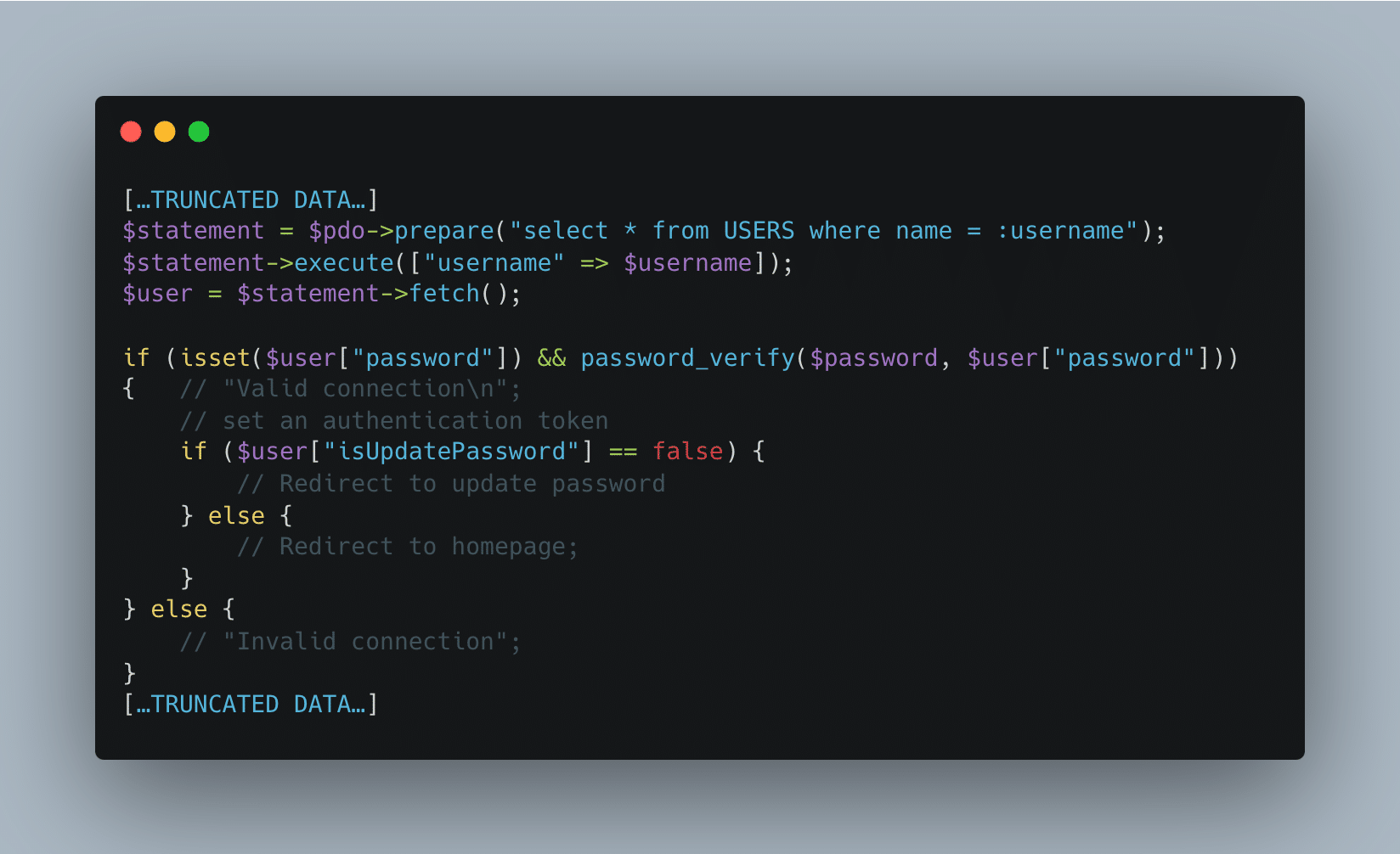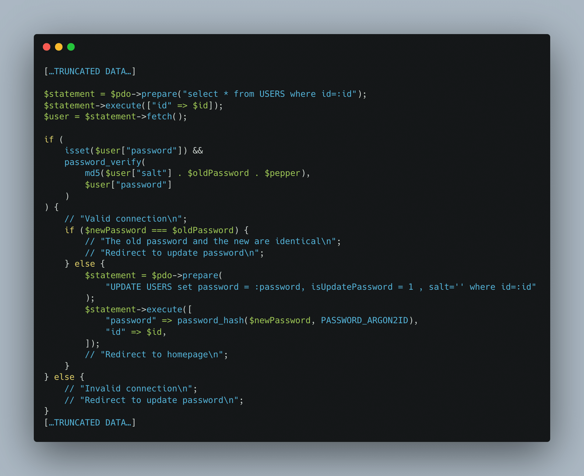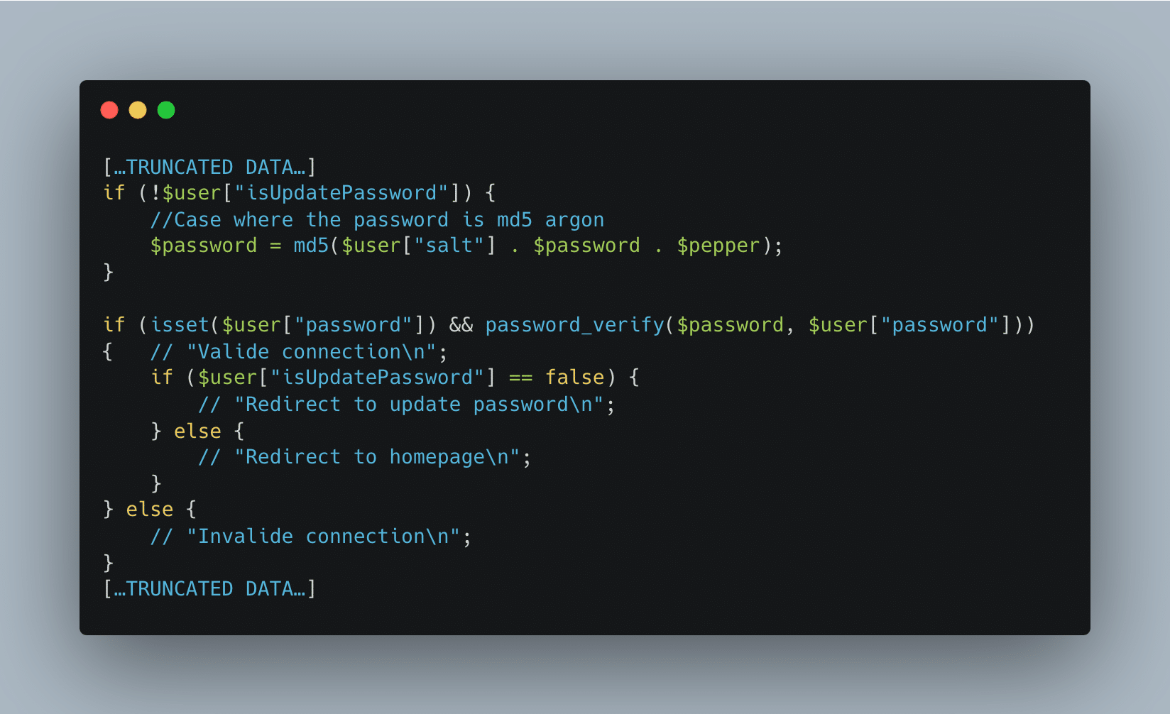 isUpdatePassword vaut false, alors l’utilisateur n’a pas changé son mot de passe et le hash sera : argon2id [md5 (sel + mot de passe + poivre)].isUpdatePassword vaut false alors, l’utilisateur a changé son mot de passe et le hash sera : argon2id (mot de passe + poivre).