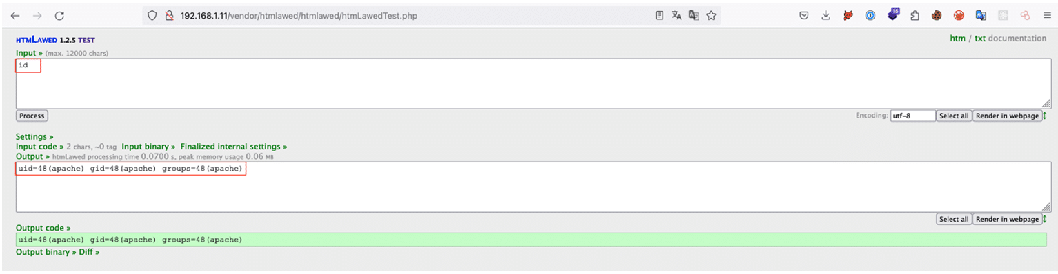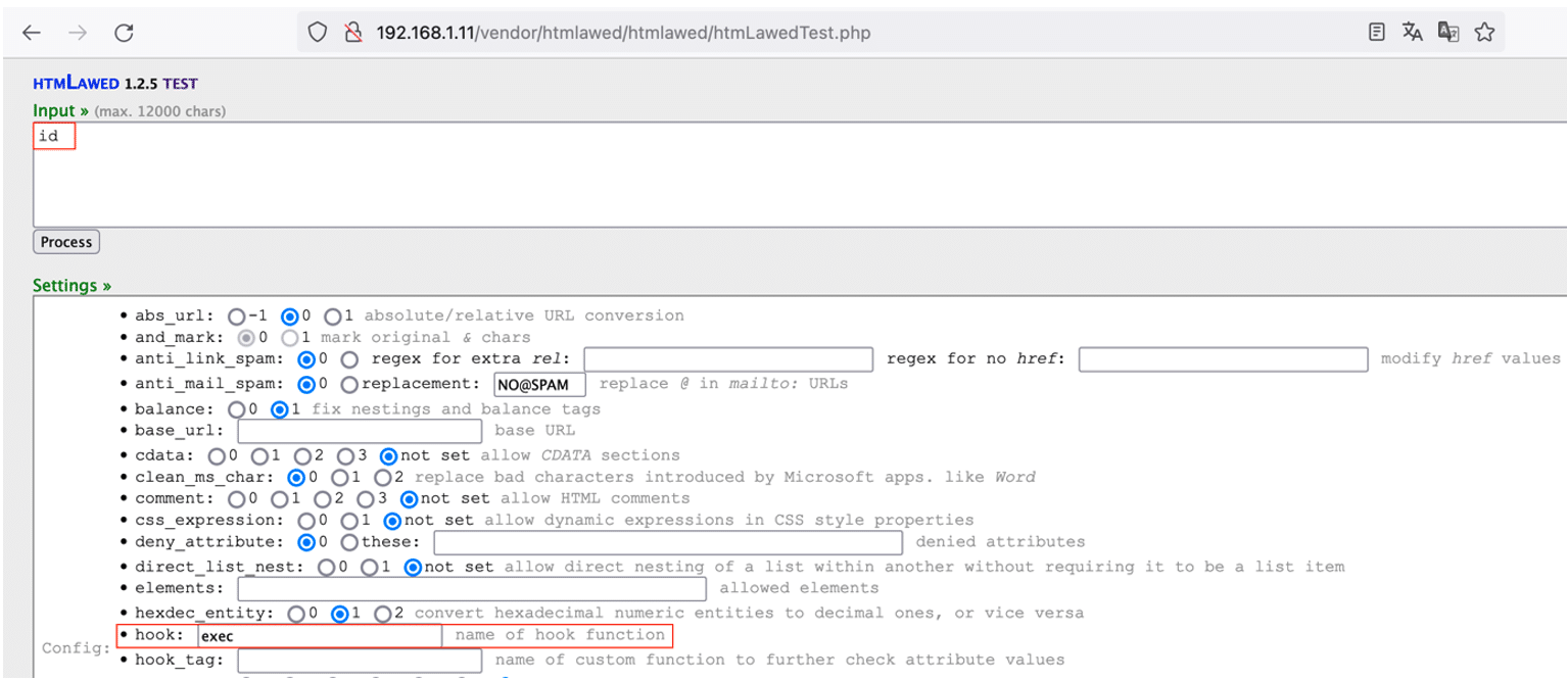 Le fichier htmLawedTest.php mentionné précédemment est accessible sans authentification et permet à un attaquant d’exécuter du code arbitraire en manipulant le paramètre hook directement dans l’interface rendant la vulnérabilité facilement exploitable :