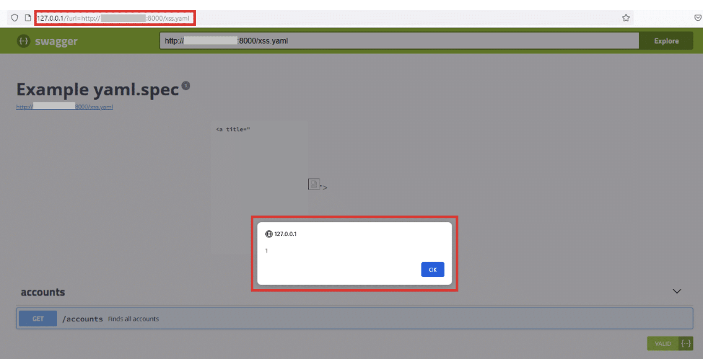 Ainsi, le payload XSS sera exécuté et la victime sera piégée. On peut voir sur l’image ci-dessous, dans le premier rectangle rouge, l’url du Swagger de la victime, http://127.0.0.1, suivie du paramètre « url » qui n’est autre que l’url pointant sur le fichier yaml malveillant de l’attaquant.