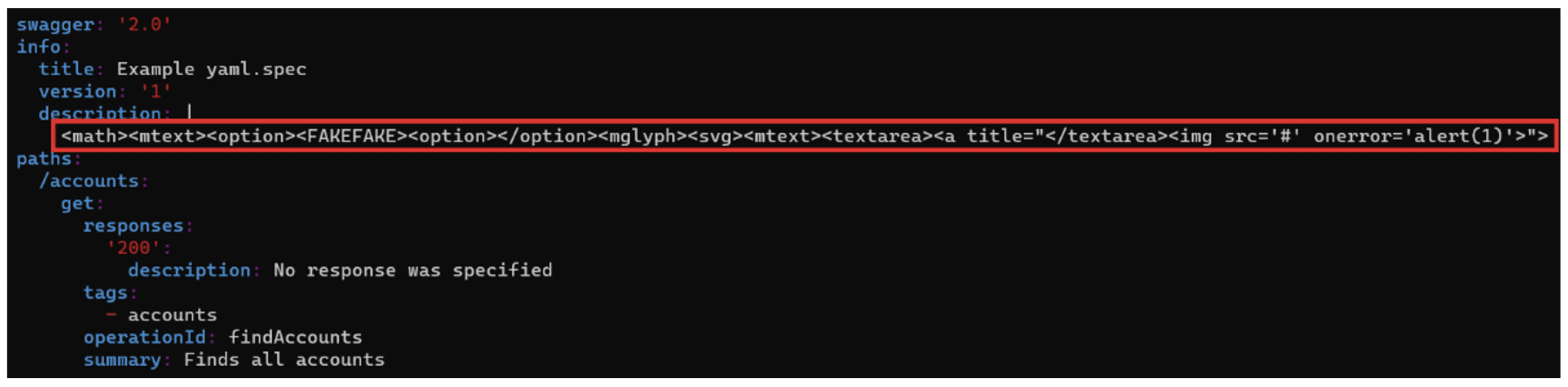 Malheureusement, cette fonctionnalité est vulnérable à des injections XSS reflétées sur les versions 3.14.1 à 3.38.0 de Swagger UI. La cause : Swagger UI utilise elle-même une librairie afin d’assainir les inputs utilisateurs qui s’appelle DOMPurify.