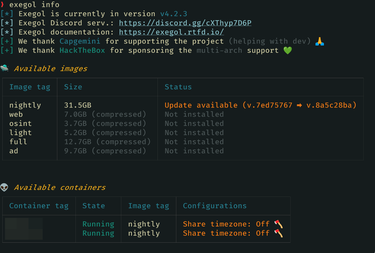Exegol propose plusieurs images Docker préconfigurées qui regroupent différents ensembles d’outils spécifiques à certaines catégories. Ces images permettent aux utilisateurs de choisir l’image qui correspond le mieux à leurs besoins.
