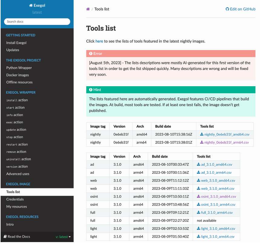 Récemment, un nouvel ajout publie les listes des outils installés dans les différentes images proposées par Exegol. Ainsi, les utilisateurs peuvent facilement connaître la liste des outils présents dans les images.
