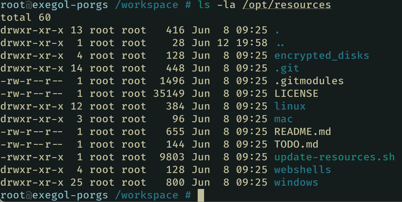 Les « Offline Resources » sont un ensemble d’outils et de scripts qui sont couramment utilisés lors des tests d’intrusion. Parmi ces ressources, on retrouve des outils tels que LinPEAS, WinPEAS, LinEnum, PrivescCheck, SysinternalsSuite, mimikatz, Rubeus, PowerSploit, et bien d’autres encore. Plutôt que de devoir télécharger individuellement ces ressources à chaque fois qu’elles sont nécessaires, Exegol les intègre directement et les partage avec chaque conteneur dans le répertoire /opt/resources.