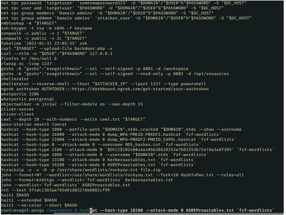 En ce qui concerne l’historique des commandes, Exegol propose un système où les commandes des outils les plus couramment utilisées sont stockés dans un fichier. Cela permet aux utilisateurs d’accéder rapidement aux commandes sans avoir à rechercher leurs syntaxes sur Internet ou à consulter des sources externes.
