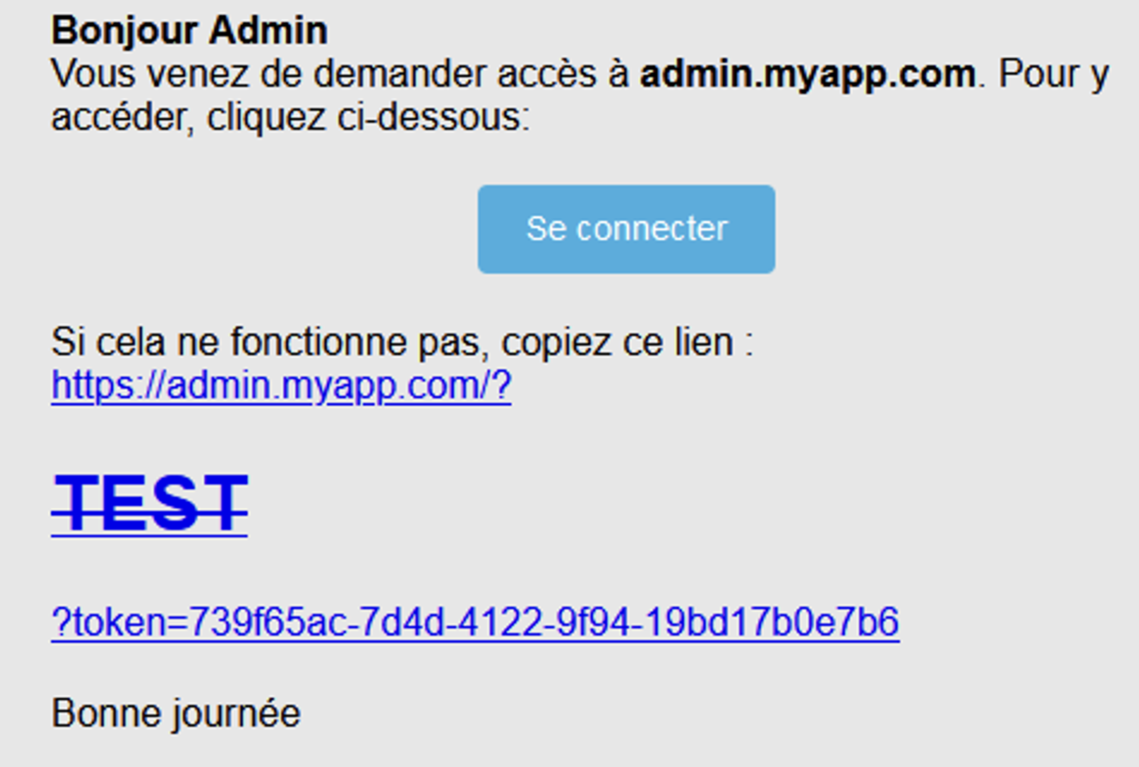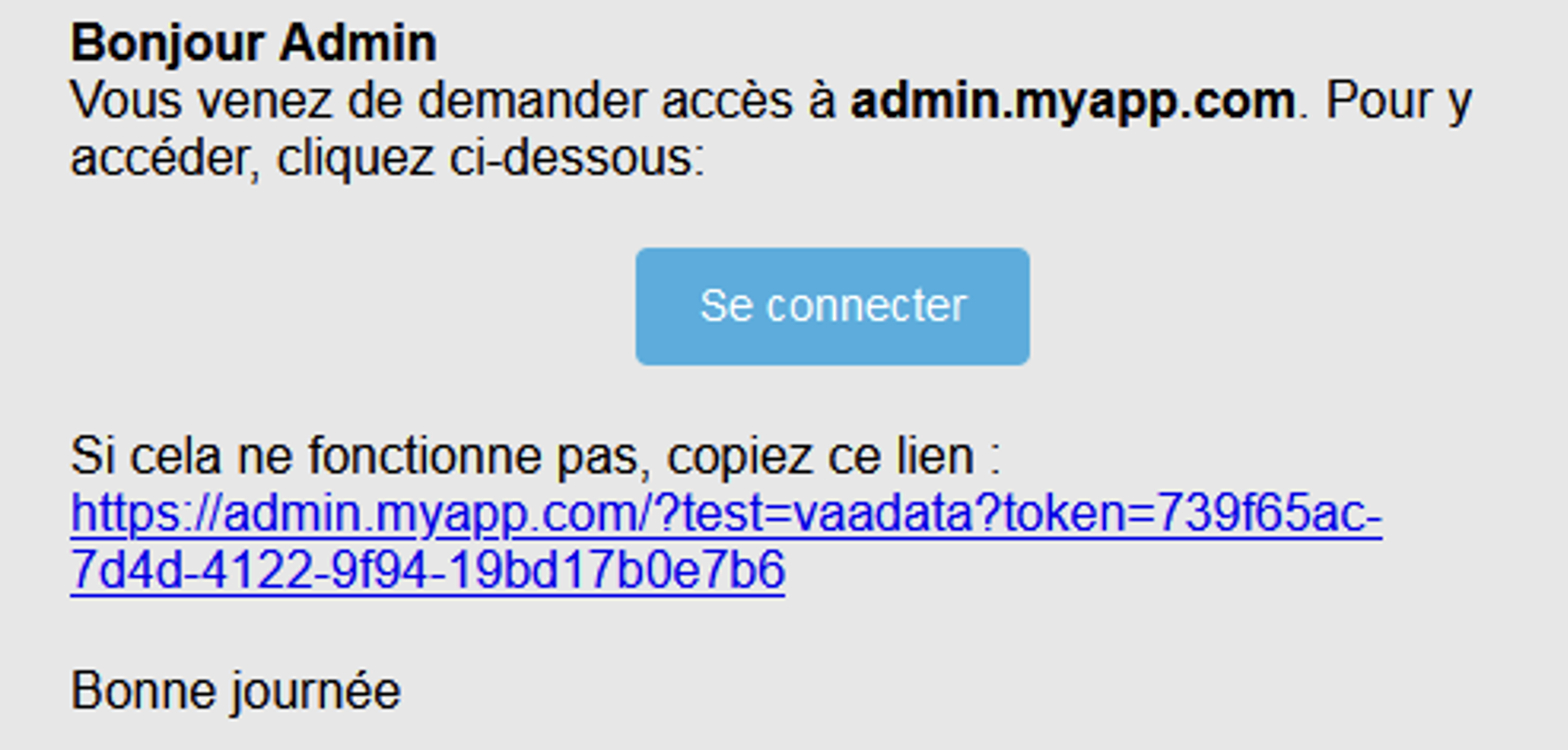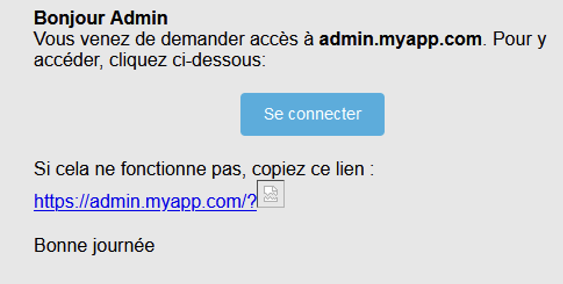 boUrl doit impérativement avoir un format valide. Elle doit inclure le protocole HTTPS.boUrl est effectuée. Seul le domaine admin.myapp.com est autorisé ainsi que d’autres sous-domaines dans une liste blanche.La raison de l’existence du paramètre boUrl s’explique par le fait que d’autres back-offices peuvent exister. Dans ce cas, le paramètre boUrl est vérifié à l’aide d’une liste blanche. Le magic link transmis dans l’email est ensuite généré pour le back-office correspondant.