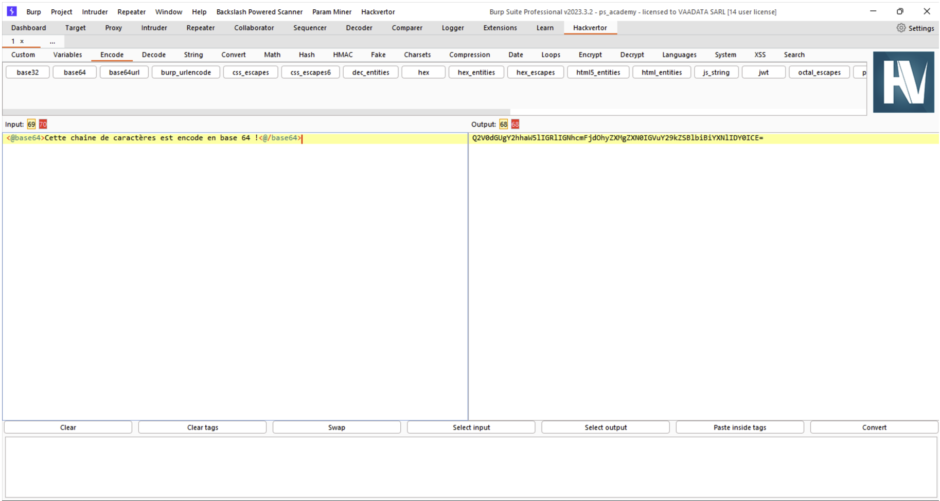 Hackvertor est une boite à outils permettant de convertir n’importe quelle chaine de caractère en l’encodage voulu. Cette extension utilise des balises XML autour de la chaine de caractère pour préciser quel type d’encodage ou de conversion à utiliser. Il est également possible d’utiliser ces balises dans n’importe quel module de Burp comme le Repeater ou l’Intruder, et il est également possible de créer ses propres balises XML de conversion pour un usage avancé.