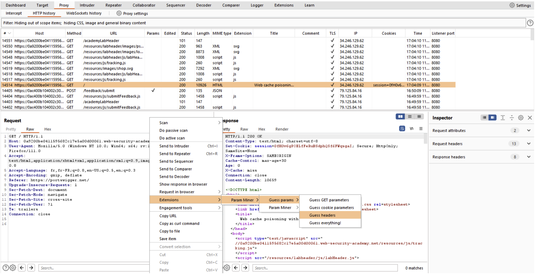 L’extension Param Miner va permettre notamment de rechercher des headers ou des paramètres cachées dans une requête donnée. C’est une extension particulièrement utile pour identifier des failles de type « web cache poisoning ».