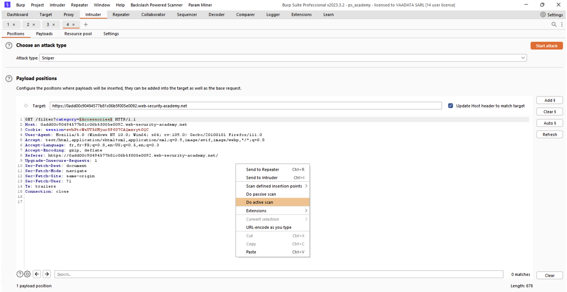 Pour lancer un scan actif, il suffit d’envoyer la requête dans l’Intruder, spécifier la position du payload comme pour une utilisation classique de l’Intruder, faire un clique-droit sur la requête et appuyer sur « Do active scan ».