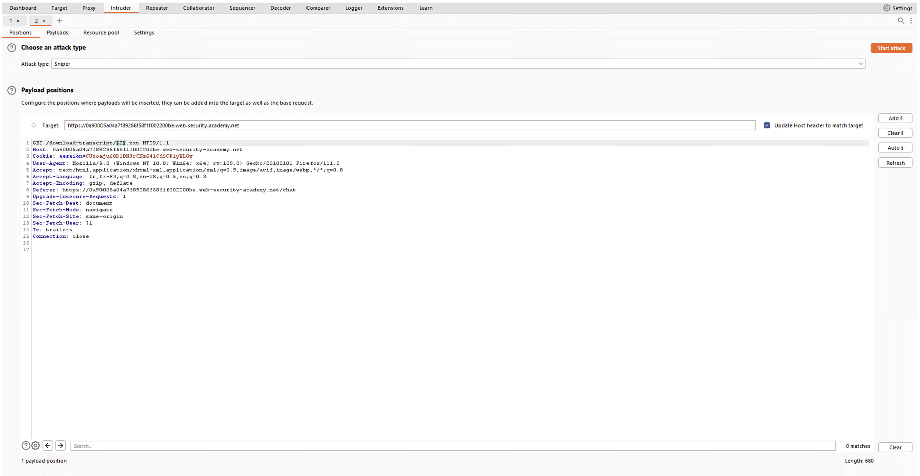 L’Intruder comporte un onglet « Positions » où le pentester pourra définir la position du payload dans la requête. Ensuite il pourra choisir le type de payload à injecter dans l’onglet « Payloads ».